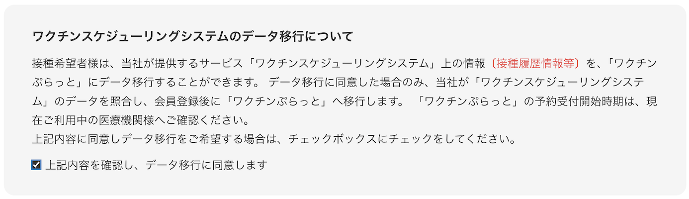 登録時に【ワクチンスケジューリングシステムのデータ移行について】のチェックボックスに✔をしないで登録すると移行ができませんのでご注意ください。